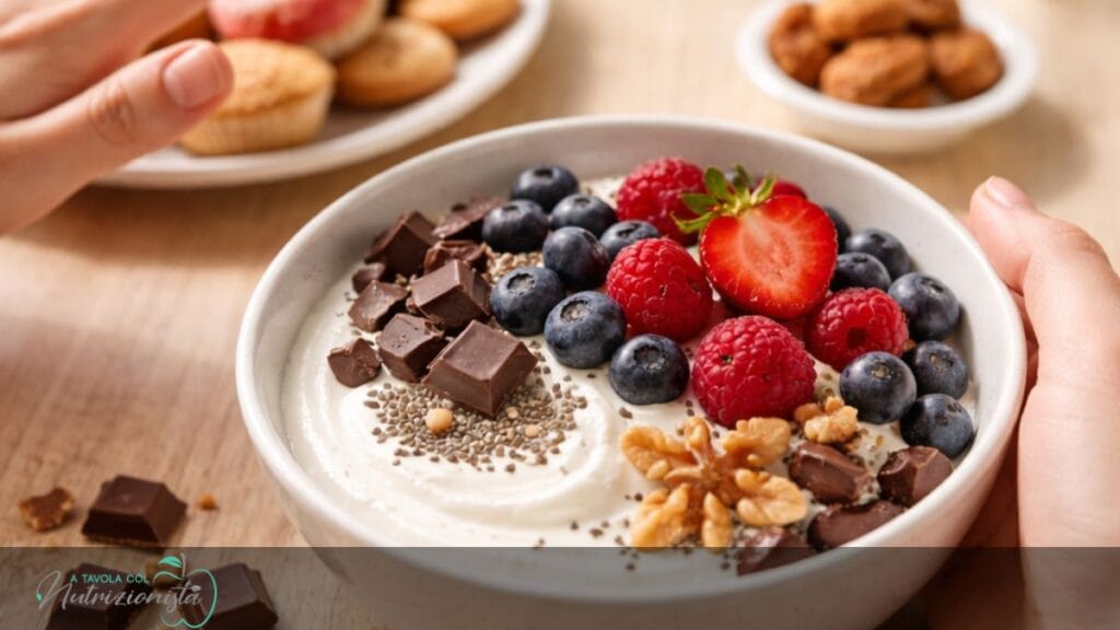 Colazione anti-craving: yogurt greco bianco con frutta fresca, una manciata di frutta secca (noci, mandorle) e un cucchiaino di semi di chia o lino. Oppure pane integrale con avocado e uova. Il principio è lo stesso: proteine + grassi + fibra.